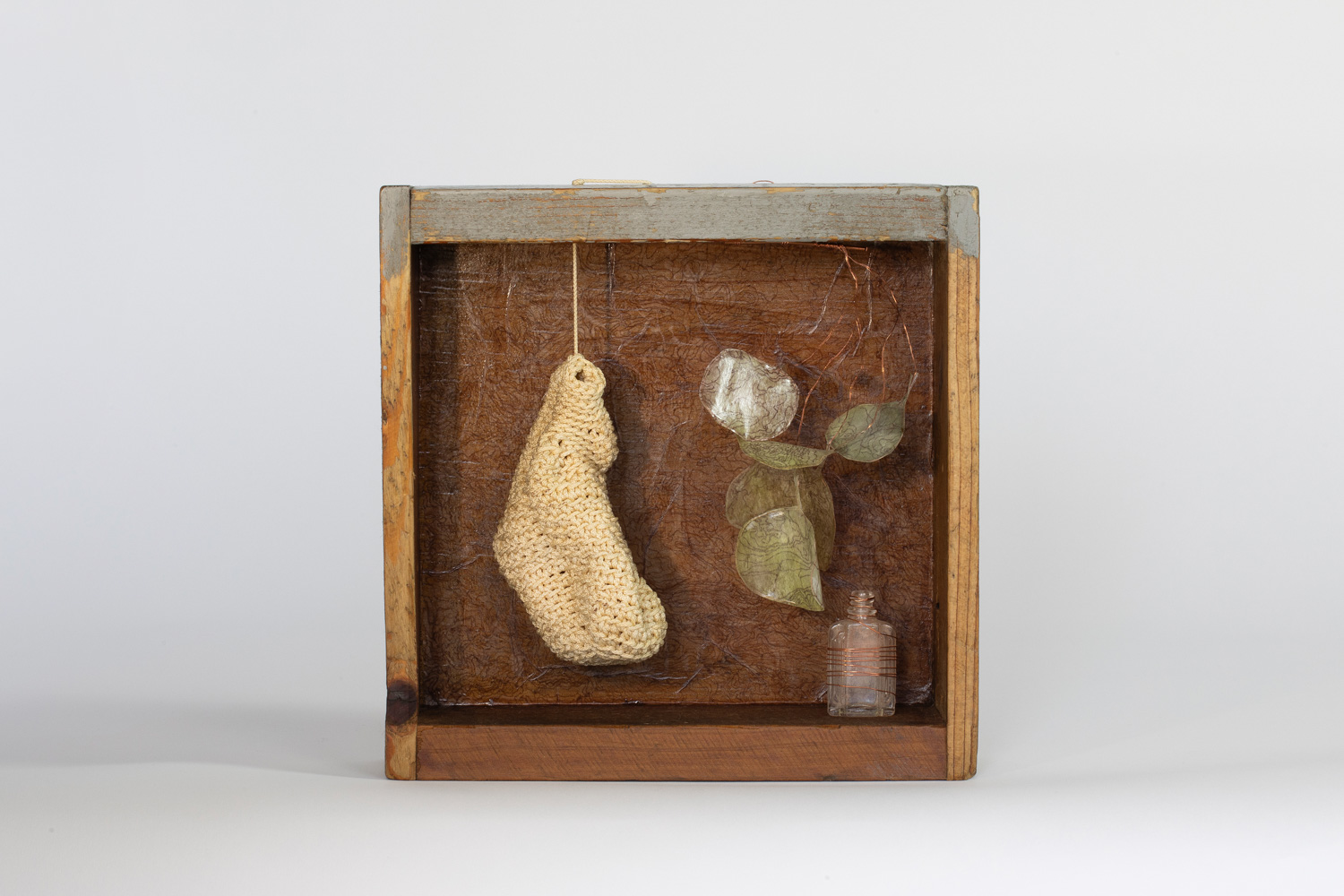 Salvaged box, vintage fishing line, bottle, paper, copper wire